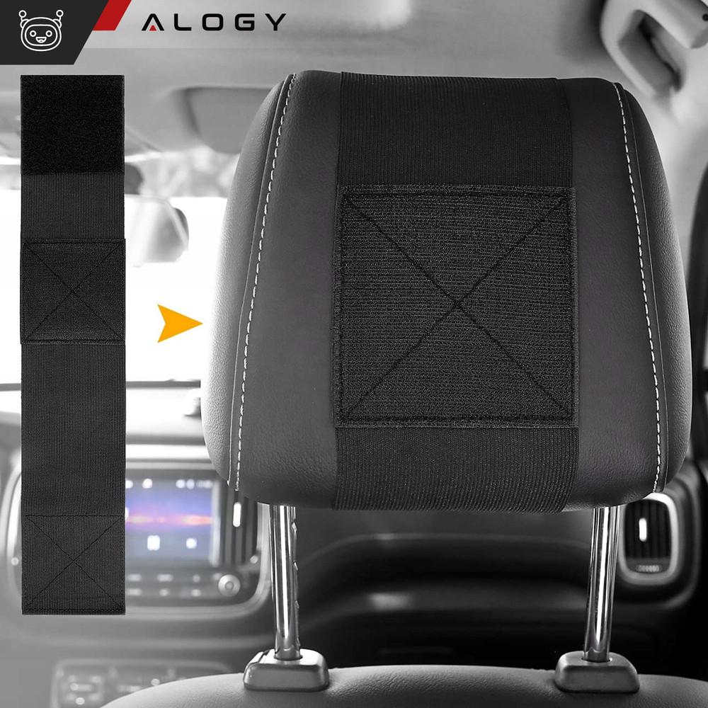 Die Kfz-Halterung für Mobilgeräte, Telefone und Tablets wird mit einem elastischen Gurt mit Klettverschluss an der Kopfstütze des Fahrer- oder Beifahrersitzes befestigt. Der Klettverschluss ist extrem stark, wodurch der Halter fest an der Kopfstütze befestigt wird.