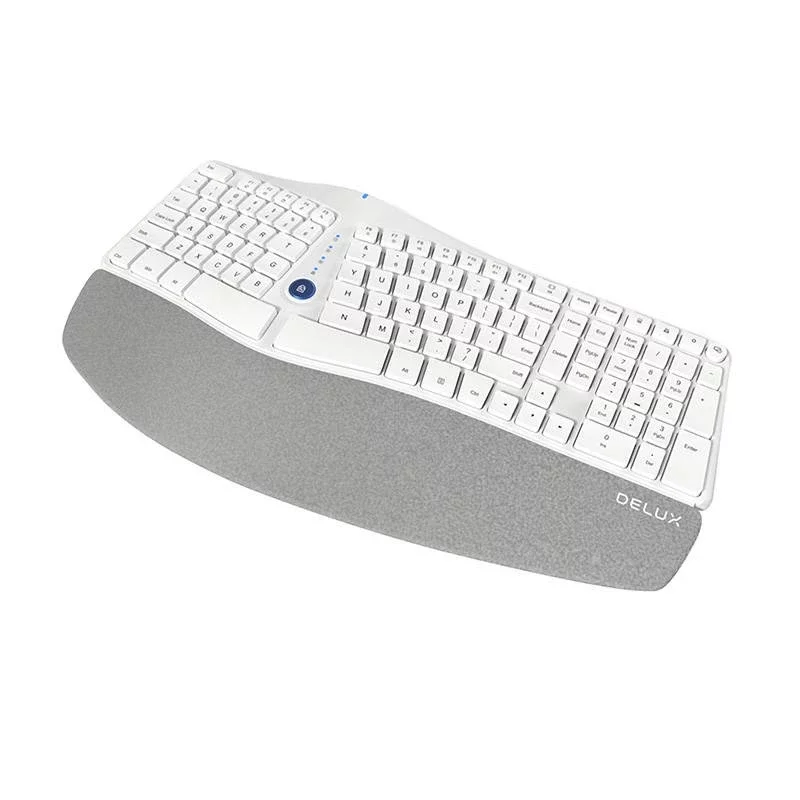 Verbringen Sie viel Zeit am Computer? Achten Sie auf Ihre Gesundheit und Ihr Wohlbefinden! Die GM901D Delux Wireless-Tastatur verfügt über ein ergonomisches Design, das unübertroffenen Bedienkomfort bietet. Es ist mit 107 Tasten und einer speziellen Handballenauflage ausgestattet. Sie können es über Bluetooth 3.0, Bluetooth 5.0 und im 2,4-G-Band mit bis zu 3 Geräten verbinden. Außerdem verfügt es über praktische Funktionstasten.