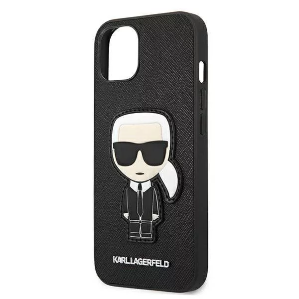 Das Etui ist aus hochwertigem Öko-Saffiano-Leder gefertigt und mit einem Aufnäher mit der Figur von Karl Lagerfeld verziert, die auf den legendären Designer verweist.