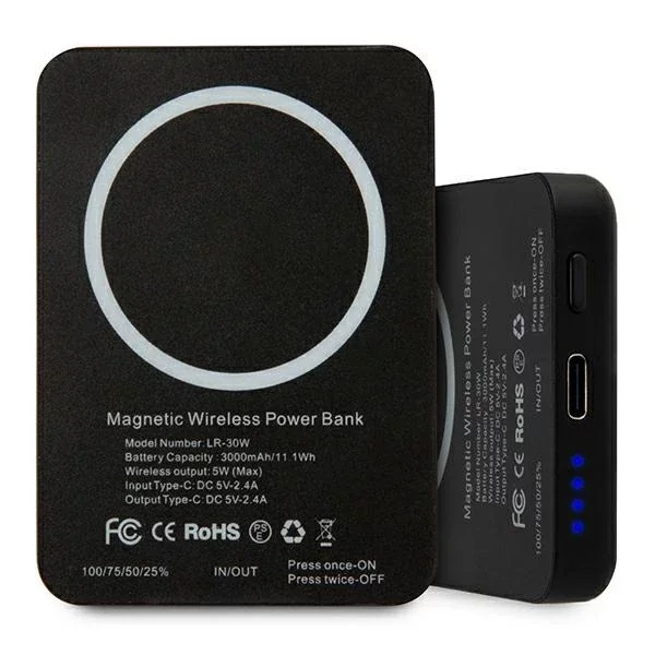 Eine stilvolle Powerbank, erhältlich in Schwarz, mit der Sie kompatible Smartphones aufladen können, ohne sie mit einem Kabel an das Gerät anschließen zu müssen. Dank perfekt abgestimmter Magnete haftet es fest am Gerät, was die Energieauffüllung beschleunigt. Legen Sie das Gerät einfach direkt auf das Ladegerät und Ihr Telefon beginnt automatisch mit dem Ladevorgang. KKCollection: Ikonic Outline Typ: Induktive PowerBank Eingangsleistung: 5 V/2,1 A Ausgangsleistung: 5 V/2,1 A Kabelloses Laden: 5 W Kapazität: 3000 mAh (3,7 V) Eingang/Ausgang: USB/C Farbe: Schwarz Produkt hergestellt unter Lizenz von Karl ]