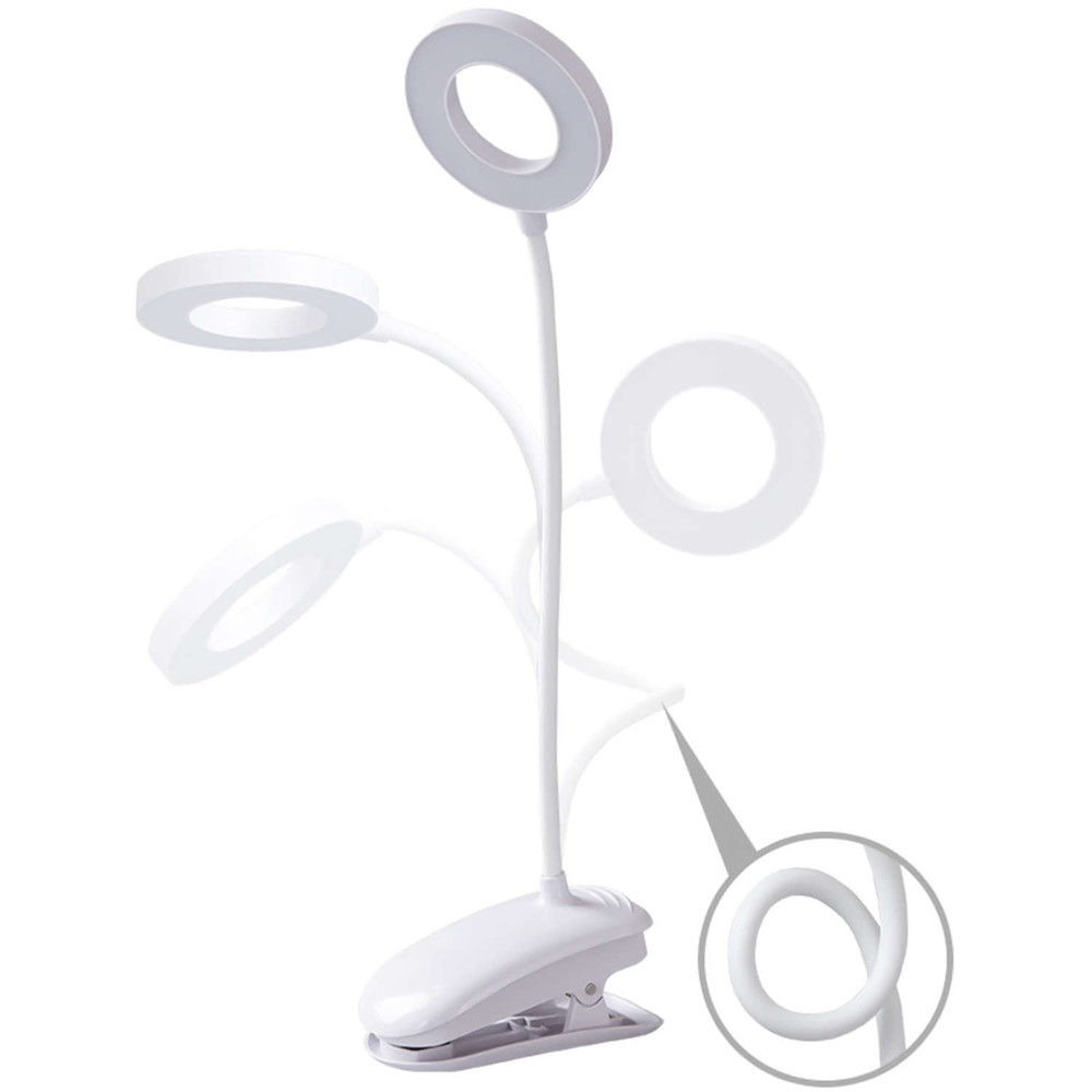 Eine universelle LED-Lampe mit Clip, die sich ideal für den Schreibtisch, das Bett oder beim Arbeiten am Computer eignet. Die Lampe verfügt über einen integrierten Knopf, mit dem Sie die Lichtintensität mit einem Klick ändern können.