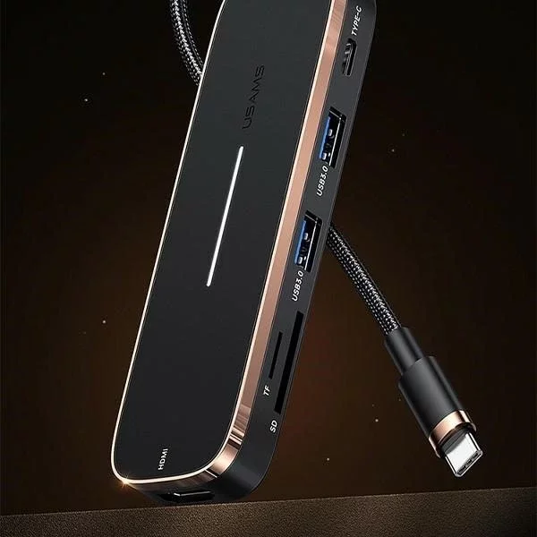 USAMS Multifunktionaler 6-in-1-Typ-C-Adapter mit 2xUSB-, 1xUSB-C-, 1xHDMI-Eingängen und einem Micro-SD- und SD-Kartenleser.